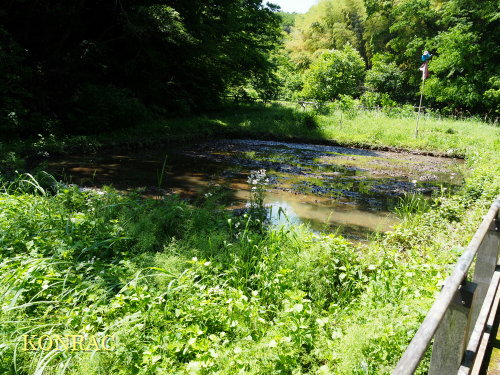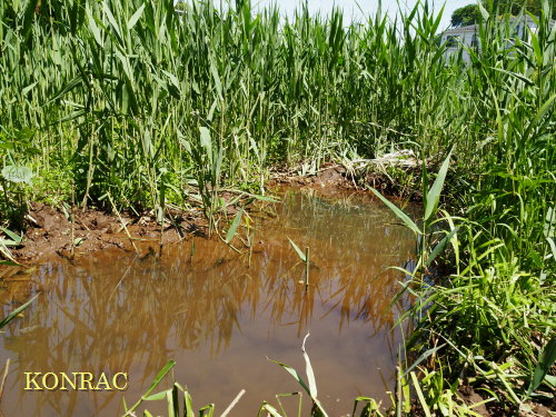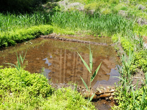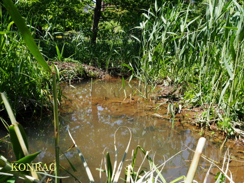 (ヨシ原の池) 水が涸れかけていたヨシ原の池の状態を観察に行きました。 降雨があったので、ホタルの里整備事業によってつくられた水路が増水して、池の方にも、水が供給されていました。 池には水が溜まっていました。