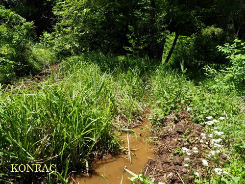 谷戸の水辺保全など 日時:2023/5/9(火) 9:30〜12:30 晴 場所 生田緑地 湿地地区(B05)、上の田圃地区(B06)、下の田圃地区(B07)、ヨシ原地区(B08) 参加者 岩田臣生 (湿地地区 B05) ホタルの国の観察会開催の支障となっているナラ枯れコナラの伐採についての現地協議を終えてから、谷戸の水辺の状態観察と水辺の攪乱を少しでも行いたいと思い、先ずは湿地地区に入りました。 サワガニが活動を始めて、雨が降ったので、湿地地区に入っているハンノキ林からの水路に水漏れ穴が開いていました。 それは予想していたことなので、イネワラで補修しました。 湿地地区2段目の水辺には、ミヤマシラスゲ、オニスゲ、ヨシなどが根を広げているため、ウェイダーとスコップを持って来なかったのが失敗で、長靴とジョレンでは、 小さな水路を増やすのがやっとでした。