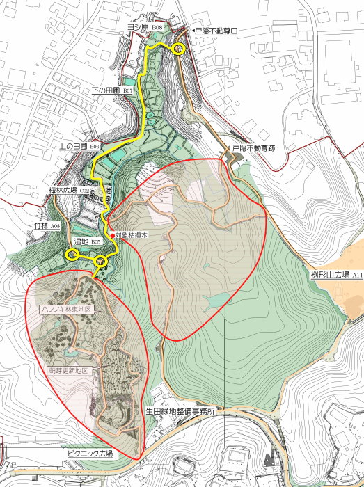 ナラ枯れ木の伐採についての現地協議 日時:2023/5/9(火) 8:50〜9:30 晴 場所 生田緑地 谷戸の芝生広場分岐付近 参加者 岩田臣生、共同事業体(三門、木)、伐採業者 生田緑地整備事務所は、中央地区北側の谷戸について、下図赤線で囲った範囲の園路を通行禁止にしました。 そこで、その部分を外して、今年のホタルの国の観察会を下図黄色線で示した木道の範囲で計画したのですが、 その範囲にナラ枯れ枯損木(下図の●対象枯損木)があるので、 その枯木を伐採するか、その場所に監視員を配置しなければ、ホタル観察会を開催してはならないという意向でした。 そこで、この時期に、当該枯損木伐採が可能かどうか、伐採業者にも参加してもらって、現地会議を行いました。 4〜6月は、生田緑地の谷戸の水辺の甲虫の代表であるゲンジボタルが蛹になっている時です。 伐採した材を水辺に近い所に落とさずに、伐採できるかが論点で、当該樹木の形状、この辺りの地形などを前提に協議しました。 その結果、材を下の地面に落とさずに伐採することは不可能という結論に至りました。 地面を振動させるようなことは、可能な限り避けたいと思いますので、伐採しない方法での開催を考えてもらうことにしました。 心配している危険は根返りによる倒木なので、安全のために、当該枯損木をワイヤーで山側に牽引しておくこと、観察会時には監視員を配置することを合議しました。 この現地会議に本来出席しているべき生田緑地整備事務所の職員が一人もいませんでしたので、この結果を伝えて、今年のホタルの国についての最終的な決断を求めることにしました。