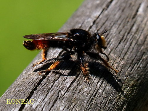 木道の手摺に、オオイシアブでしょうか、ムシヒキアブの仲間がいました。