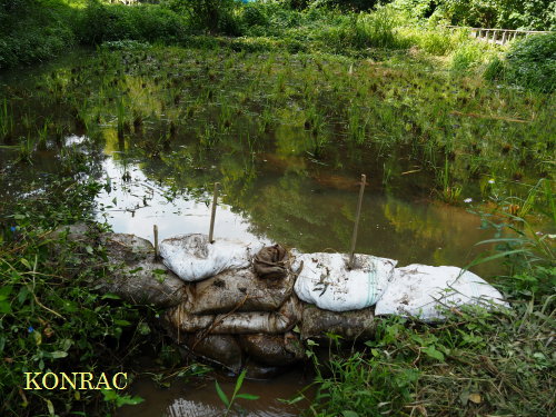 次に、上の田圃の下の段には凸凹した泥面が見えていたので、排水堰の点検を行いました。 一昨日、9/26(火)に、土嚢3袋を追加したのですが、堰の端の方から水が漏れ出していました。 どこから漏れ出しているのかと、田圃の内側をで手探り、怪しい場所を見つけたので、イネワラを詰めて、泥を寄せました。 少し経ってから、また点検すると、今度は上の方の土嚢の間から染み出していました。 これは、一番上の土のうの一枚に原因があるらしいとは思いましたが、スコップを持参していなかったこともあり、体が動きませんでした。 湿度表示が、90%で点滅していました。