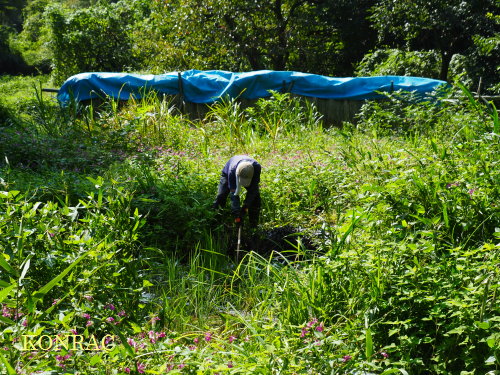 次に、木道下から上の田圃の上の段までの水路に溜まっていた泥を上げました。 やはり、田圃に入って直ぐの所に、流れが運んできた土砂は溜まります。 水路沿いにもツリフネソウが繁茂していますが、少し潰してしまうことになるのは止むを得ないと思います。 辺りの草地には、ツリフネソウの花が広がっていますので、観察に来園する人たちも気がつかないでしょう。