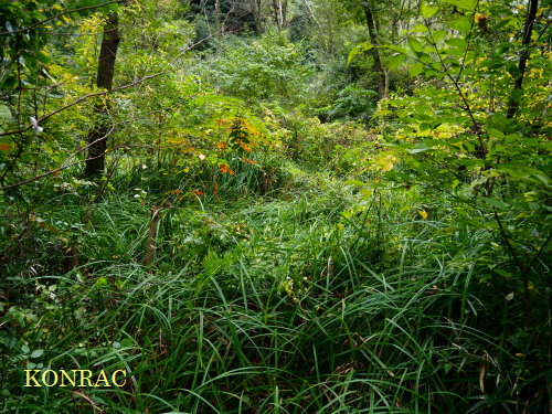 東支谷戸 A07-07 は、ここで発芽した幼木が育ち、アズマネザサが繁茂していましたが、左岸斜面際のアズマネザサを刈りながら進んで、 ナラ枯れ大木を伐倒した時に、伐採材を玉切りにして置いた場所の状態を観察しました。 それから、アズマネザサを刈りながら、水が染み出している場所を探しましたが、見つかりませんでした。 更に、貴重種の群落の状態を確認するために、アズマネザサ刈りをしながら進みました。 この群落は枯れてはいませんでしたが、中央部に、径 15cmほどの落枝がありました。 この落枝は取り除いておきたいと思いましたが、長さがあり、時計を見たら、14:10 でした。 14:30からの会議に出席するために、今回は諦めました。