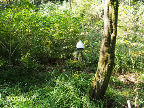 (A07-03) 低木層を低く管理して、ホタルの飛翔空間を確保することを第一目的に、サンショウ、キブシ、クサギ、ウワミズザクラ、ヤマグワ、ヒメコウゾ、ハリギリなどを伐採し、 アズマネザサ、オカウコギ、モミジイチゴ、ノイバラなどを刈る活動を行いました。 枝が針で覆われた植物は、手や腕に刺ささるので、手強い相手でした。 また、伐採したら枯れるのではないかと心配したウワミズザクラは、勢いよく、萌芽していたので、若い樹木は伐採しても問題無く、萌芽してくると思いました。 水流部分には、ミヤマシラスゲが繁茂して、水面を隠していましたが、先ずは、陸地部分の低木層、草本層の攪乱を行って、得られた材は、 水流を階段状にするための落枝ダムの材料とするつもりで、必要になりそうな場所に積みました。 こうした材は、これからも出て来ると思いますので、水流の手入れは、陸地部の活動を終えてからで良いだろうと思います。