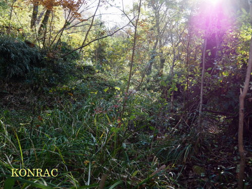 (A07-01からA07-02への移行部) 2007年に、ハンノキ林上の池からの水路を2本に分けて、大部分を陸地化した場所に流し、林内に水溜まりをつくる活動などを行いました。 今回、この辺りのミヤマシラスゲの繁茂の状態を観て、この水流が、辺りを湿地化し、主要な水流になっていることが分かりました。 これと斜面裾部とを合わせて、昆虫が飛翔移動できる空中回廊をイメージして、アズマネザサを刈り、モミジイチゴなどの低木を伐採しました。