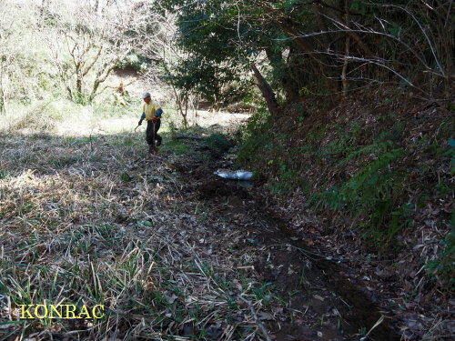 (城山下谷戸合流部) 次に、城山下谷戸合流部に行きました。 ここは、20年前のような湿地状の草地にすることを目指して、田圃状の水溜まりをつくりつつあります。 今回は、そこに水が溜まっていましたので、水が染み出す小さな穴を塞ぐために、底土を掻きまわしてみました。