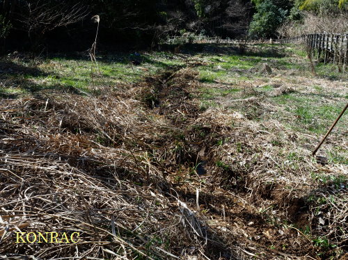 その水路が行きつく辺りのオギなどの枯草を刈り、太めのアズマネザサの支柱を立てて、カントリーヘッジとしました。 また、水路の勾配が急になる手前に、水溜まりをつくりました。 この水路をつくったばかりの頃は、その小さな水辺に、キジバト、シジュウカラ、小さな冬鳥などが訪れていたこともありました。 木道から観察し易い場所なので、野鳥たちが水場として利用している情景をイメージしています。 しかし、田圃下草地には、大きなモグラ穴?が縦横に走っているので、中央水路は頻繁に水涸れを起こします。 まあ、状態を観察して、適度な攪乱を繰り返すことを考えていくつもりです。