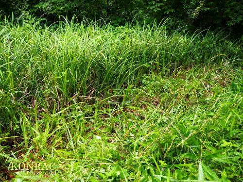 2段目から3段目に水面をつなげましたが、3段目のミヤマシラスゲの繁茂は著しく、水面はミヤマシラスゲの茂みに被われていました。 試しに、岸から水面までの間のミヤマシラスゲを刈ってみました。 この辺りには、コケは見られなかったので、現時点では、可もなく不可もなくといったところでしょうか。