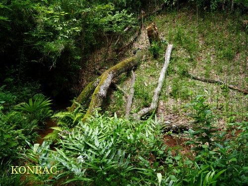 ●城山下谷戸合流部 城山下谷戸合流部には、一面に、ミョウガが育っていました。 昔の景色が蘇ってきました。 水辺に転がしておいた枯木には、コケが生えていました。 この場所の環境再生について、希望がでてきました。 ただ、この地区の外周に回した水路には、いくつもの水漏れ穴ができていましたので、気がついた穴を塞ぎました。 そして、今年切り開いた道を歩いて、苗木畑に抜けました。
