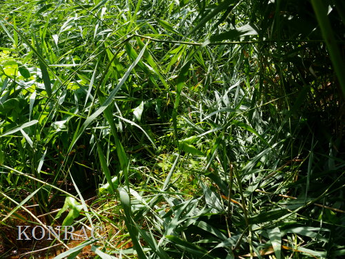 上の田圃の水は涸れていませんでしたので、下の田圃に移動しました。 下の田圃の奥のヨシが前に倒れるように繁茂していましたので、田圃雑草を保護ずるために、少しヨシを刈ることにしました。 ヨシの茂みは、風が無くて、暑いので、次回にしたいと思いましたが、田圃雑草は既に花茎を伸ばしていたので、早く、日光が入る状態にしておかなければならないと思い、 意を決して、作業することにしました。
