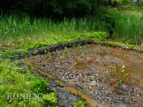 C下の田圃の水路と田圃の泥上げなど 日 時) 10:40〜11:50 晴 場 所)下の田圃 活動者)岩田臣生、田村成美、鈴木潤三 この田圃は、2004年に再生した田圃です。 当初から膝上まで潜る湿田でしたので、長靴で気軽に入ることができません。 田圃としての手入れは怠り勝ちですが、深い泥田に入る経験をさせてあげられる場所として、また、在来の生物が残る沼地として大切な場所だと思っています。 県内では生田緑地のみの生育となってしまった植物を保護していましたが、今年は、発芽したばかりのところを、カルガモに食べられてしまいました。 田圃の奥の水流がヨシに占拠されてしまっていたので、水流のヨシを根こそぎ刈って、泥上げも行いました。