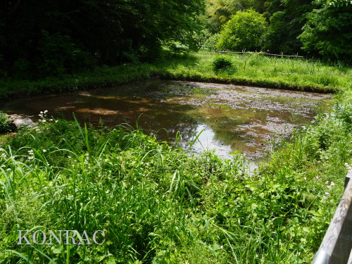 また、上の段は木道側にも、水面が広がっていましたので、堰を少し下げて、下の段に水面を広げることを優先することにしました。 その広がり始めた水面に、辺りの草の花粉などを浮かべて、流れ方を観察し、怪しい場所の水漏れ補修を補足していきました。 上の段の水漏れ補修や、田圃上の水路の泥上げなどを済ませたら、上の段の堰から落ちる水の音が大きくなり、流量が増えたことが分かりました。