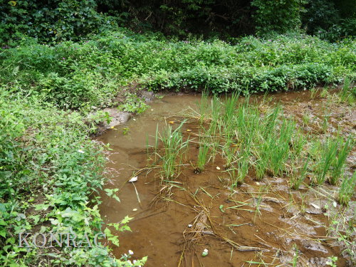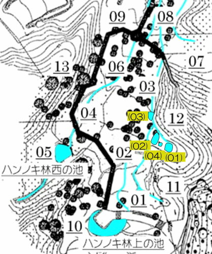 ハンノキ林の水辺再生 日 時)10月9日(木) 9:00〜12:00 曇 風 場 所)生田緑地 上の田圃(B06)、ハンノキ林(A07-03) 活動者)岩田臣生 上の田圃 前回10/7(火)の結果を確認するために、上の田圃に行きました。 導水路には少ないながら水があったのですが、上の田圃の堰を越える水は無く、下の段の外周の溝は水涸れしていました。 上の段の堰の近くあった水漏れ穴は塞ぎました。