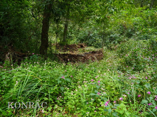 水辺に戻したい場所には、ツリフネソウやミゾソバが咲き乱れていますが、これらを刈って、地表 30〜50cmの土を取り除かなければならないことが分かりました。 最近の活動で掘っている点的な穴を繋ぐ線が、つくろうとしている水辺の主要な流路にできると思っています。 |