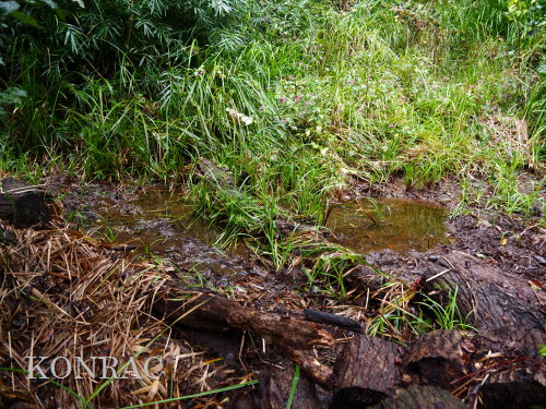 田村さんには、ハンノキ林東地区(A07-11)の斜面下の草刈りをお願いしました。 03、05、06は、ハンノキ林東地区(A07-11)の斜面下を流れる水と、01、04、02から流れて来る水の合流する場所です。 01〜03の水辺再生イメージができてきたので、こちら側の状態を調べることにして、草刈りを行いました。 ハンノキ林東地区(A07-11)のナラ枯れ大径木伐採時に、ここを通るために置いた材や、玉切りした伐採材などが転がっています。