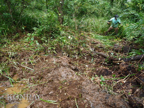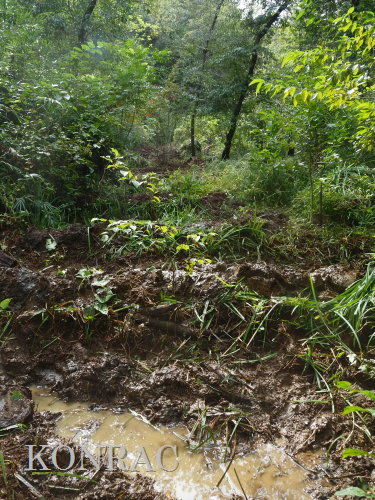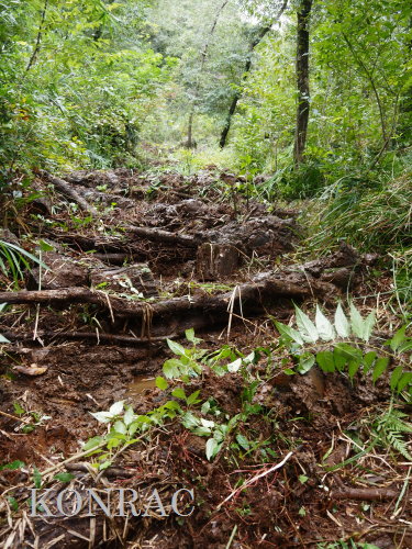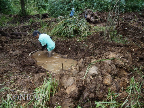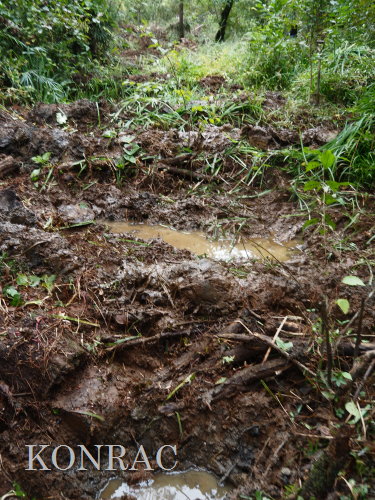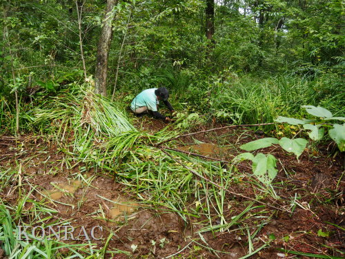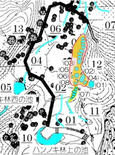 昨日の雨によって、この辺りの地下水位が上がってきたようです。 地下の飯室層の上の砂礫層に水が流れているようで、どこでも、穴を掘れば、水が溜まるようになりました。 この日は、水溜まり穴03の北側のミヤマシラスゲやミゾソバが繁る水流跡の泥上げを行って、階段状の水路を露わにしていきました。 残念ながら、木道まで届きませんでしたが、ミヤマシラスゲなどの根が邪魔することを除けば、水は平常時の水流の泥上げと同じような状態になっていました。