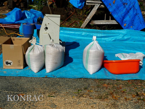 雑のう袋3袋の籾の籾摺りを終えて、籾殻2袋と玄米1袋となりました。 昨年は収量が少なくて、一部の人にしか分配できませんでしたが、今年は、田圃活動に参加してくれた全員に、少しずつですが、分配できそうです。