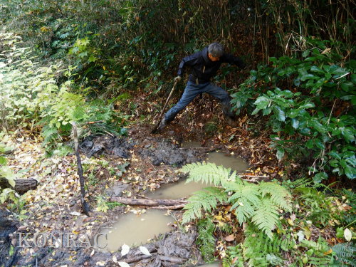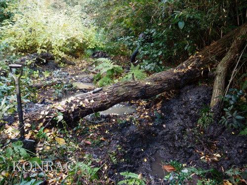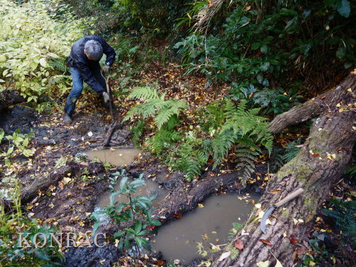 (上図)11/27(木)の活動場所図 久し振りの野鳥の森の水流は、水面が消えて、湿った土面が続いていました。 しかし、スコップを入れたら、柔らかい土で、掘った穴には直ぐに、水が湧いてきました。 ハンノキ林の現状とは雲泥の差があるのに驚きました。 20cm程度の深さの水溜まり穴が簡単に掘れて、次の水溜まり穴を掘っているうちに、開放水面が広がっていくのです。 ただ、スコップを使う穴掘りは腰の負担が大きく、毎回行ってきた範囲だと思うのですが、1回で完了することはできませんでした。