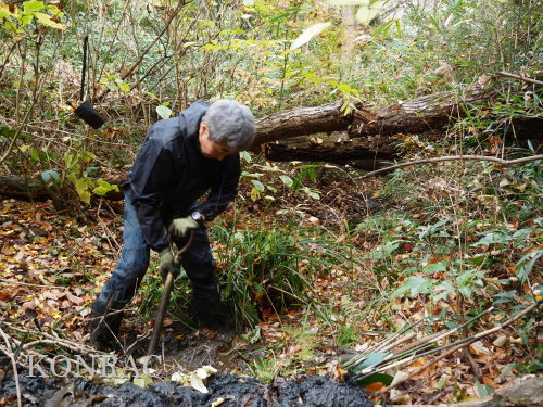 泥面と言っても、足を踏み入れれば、ズボッと潜るような柔らかい泥溜まりです。 周囲の草木、枯枝、落枝などを積んで、その上に、泥を上げて、堰をつくることで、水溜まり穴をつくります。 そこに水が溜まるまでには時間がかかりますので、後は自然に任せます。