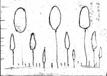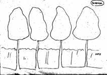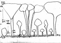 【加藤】 だいぶいろいろな意見がありましたが、はたして、この高木が10年経ってどのくらい大きくなるか。おそらく立ち枯れすると思うんです。10年周期くらいに。新しい緑を良くしていくのだったら、古い木をどうするか。例えば、この下は混み合っていますね。木が太れない状態です。邪魔になる所を切って日当たりを良くして行かないと。このままでよいのかなと考えます。これからは、古い木を処分して新しい木を育てていく、ということをしないと。伸び放題ですね。その辺は、何かしないと木が伸びられません。混んでしまって。 【倉本】 いま加藤さんの言われたようなことに関しては、さっき描いていただいた図はあまり役に立たないですね。1本、1本の木がどういう関係になっているかが大事なのでその図では役に立たなくて本当の状態の図を描かないと役に立たないので、それに今日やっていただこうとしたことはつまらなかったのではと思い申し訳ないです。 【中島】 絵が下手ですが、斜面にしてみました。現在は、圧倒的に高木が多くて、亜高木、低木が少ない。草本はまあまあかなという状態だと思います。 放っておきますと、色々な所を見て歩きまして、典型的な放置された樹林地というのは多摩川の崖線の緑地では北浦緑地が一番放ったらかしなのです。まさに岩田さんが言ったように藪状になってしまいます。鳥の糞から生えた常緑樹が威張って、下草も刈ってないから人が入れないくらいゴチャゴチャになっている。おそらく20年放置したら条件は若干違うが、そんなふうになるだろうと思いました。 それから望ましい雑木林というのは、私ども雑木林を育てる会が発足以来やっていることは生田緑地全体の雑木林をこうしようということではなくて、所々に典型的な所謂、昔の里山風景を残そうよという事で考えています。ここもその一つだと考えて、望ましい雑木林は、今の形ではあまりに混み過ぎているので、もう少し本数を少なくしたいこと、それから常緑樹はできるだけ排除して雑木林を中心にした林にしたいということ。それから、中木や低木は沢山なくてもよい、極端に言うと無くてもよいと思っています。何故かというと、20年ぐらいで高木の萌芽更新をして、伐採により新しい芽を育てるという形で雑木林を更新していくのが望ましい雑木林だと考えました。