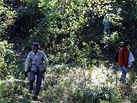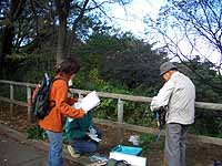 (表の区画番号1が最上部、7が最下部のピクニック広場の位置です。また、●は最大の木があった方形区です。) ヤツデも斜面の上の方にあって、下の方には無いという傾向があった。少し違うのは、範囲が狭かったり、個体数が、アオキはA、Bが多かったのに、ヤツデはCが多くなっていた。 2つの種を重ね合わせてみると、片方だけでは分からなかったことが分かることがある。 ヤツデの場合も、個体数の多い方形区に大きな個体があるという傾向が見られた。 林の下にある木のことを考える時は、下の木だけで考えるのではなくて、上の方の木のことを考えると分かりやすい。 上に枝を張っている木があると、鳥が糞を落とす機会が高くなる。 こういうことを調査するためには今日の調査では不十分で、上の状態を調査する必要がある。 樹冠投影図というものを描くことが多い。 実際に木を上から見ることはできないが、木を上から見たとして、どの様に葉が分布していて、どこに根元があるかを描く。 これはまたいつか、やりたいと思うが、今日の作業より大変。 この調査区については1年間おいてどんな変化があるかを見たいと思う。それには今日ぐらいの作業量が適当と思う。 (意見) 1年経っても、余り変化する様には思えない。 B班の区域では、実生のシラカシなどが見られたので、これらの変化も楽しみ。この他の種も3番の方形区に集中していた。 シュロが無かったのは何故か。シュロも鳥で増えるのか。木道沿いにはシュロが生えている。 |