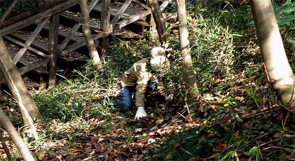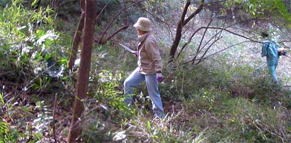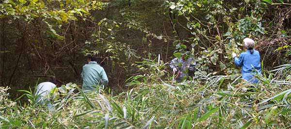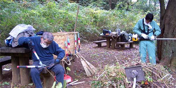 「ピクニック広場周辺地区(A05)東斜面樹林の下草刈り」 日時 11月15日(水)10:10〜12:00 場所 生田緑地ピクニック広場周辺地区(A05) 参加 一般/ 増田 雑木林を育てる会/ 白澤光代 かわさき自然調査団水田ビオトープ班/ 毛部川弘行、下口達夫、前田宏 かわさき自然調査団野鳥班/ 水田茂子、森 佳子 川崎市北部公園事務所/堀江洋、山口泰民、鈴木修司 市民部会事務局/岩田臣生、岩田芳美 参加者12人 当該ゾーンは、秋冬期には容易にアオジに出会えたり、フユシャク♀が現れて交尾行動が観察されたりする場所でしたので、 下草刈り等についてのコンセンサスもなかなか得られず、所謂、放置された樹林になりつつありました。 話し合いを積むことで漸く木道沿いの一画についての下草刈りについて同意が得られ、実施できることとなりました。 園路沿いについては来園者が気持ち良く感じる空間であることが必要ですが、同時に里山の生物にとっても適度な管理が必要だと思います。 市民部会の基本は「取り返しのつく範囲で、やってみて考える」です。 今回はピクニック広場の上側の斜面の4分の1程度について実施しました。 やってみて、園路から広場が見えるようになり、林床が明るくなって、春になったら様々な花が見られそうな予感のする気持ちの良い斜面が広がりました。 参加者全員がやって良かったと感じたことと思います。 少人数でしたが一般参加が1名あり、予定の範囲をやり終えることができ、楽しい市民部会でした。