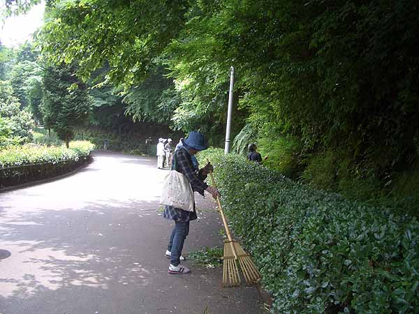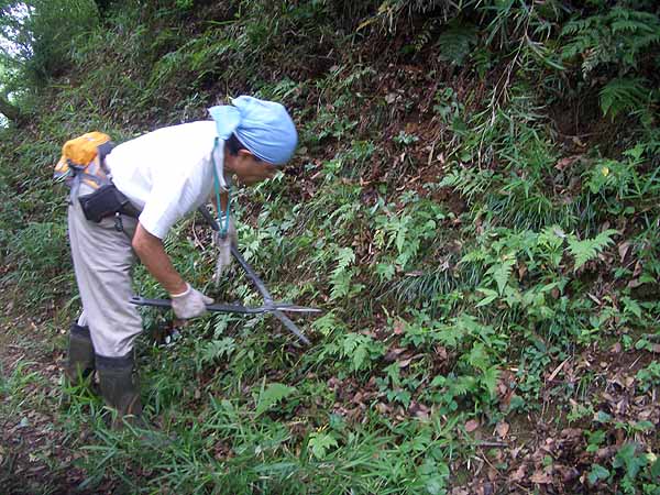 日時 2009年6月19日(金)10:00〜11:30 曇 場所 生田緑地 参加 かわさき自然調査団植物班/吉田多美枝、佐藤登喜子、武久春美、佐崎藤子 市民部会事務局/岩田芳美、岩田臣生 参加者人 6人 自然のままに放置しておくと強い植物が繁茂し、弱い植物が消えていきます。 それが自然で、人は特定の植物に手を貸すのは適切ではないという意見もあります。 しかし、気持ちの良い樹林、多様な生物が棲息できる場とする目的で、人が特定の植物を保護することはあっていいと私は考えています。 かつての里山では、薪や炭を、シイタケを、落葉などをとる目的で雑木林の管理を行っていました。 現代の市街地の中の里山では、生物多様性保全と気持ちのよい景観づくりを目的とする植生管理がなされてよいと考えています。 昔、路をつくった時に造られた小さな切土の急斜面に生育していた絶滅危惧植物を保護する目的で、 かわさき自然調査団植物班では、年1回の手入れを行っています。 この日は、その活動を行いました。