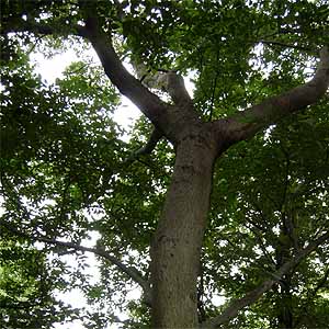 【アカガシ】この奥に常緑樹があります。アカガシです。カシ類の中で一番材質が硬い。木刀をつくりました。 商人の家で玄関に心張り棒をかけましたが、アカガシを使っています。天秤棒にも使いました。 雑木林には似合わない樹木です。林床に何も育たないし、他の樹木が侵害されてしまう。農家は木刀をつくりません。 冬でも成長しますから落葉樹に勝ってしまう。 材質が紅い。葉の縁に鋸歯が無い。葉柄が長い。 生田緑地は里山として使われたことが余り無い。