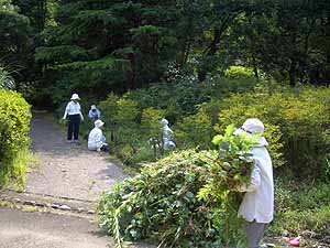 日時 2009/9/16(水)10:15〜11:30 場所 生田緑地 参加 かわさき自然調査団植物班(吉田多美枝、佐藤登喜子、渡部富子、小松ユキ、武久春美、佐崎藤子、 林美幸、権藤シナ子、今堀富子、石渡キミ子、吉留憲子、白澤光代) 市民部会事務局 岩田臣生、岩田芳美 青少年科学館に近いアジサイ山の入口付近にケヤマハンノキの実生がたくさん出ていました。 植物班が観察会によく使う場所でもあったことから、この実生を刈り取る活動を行うことになりました。 始めてみると意外に簡単に抜けることが分かり、伐らずに抜き取ることになりました。 ケヤマハンノキ実生を抜き取るとヒサカキの実生がたくさん出ていましたので、これも抜き取りました。 同じくセイタカアワダチソウなども抜き取りました。 残すものと取り去るものを区別しながら、植物班ならではの活動が展開されました。