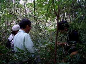 日時 2009/9/27(日)10:00〜13:00 場所 生田緑地 参加 草野昌代 かわさき自然調査団植物班(吉田多美枝、佐藤登喜子)、水田ビオトープ班(雛倉正人、前田 宏) 北部公園事務所(堀江 洋) 市民部会事務局 岩田臣生、岩田芳美 今年度第6回市民部会は萌芽更新地区を対象に植生管理を評価するための樹林のチェックを新たに用意したチェックシートを使って行いました。 曇空で暑さは差程でもなかったのですが、蚊の襲来は避けられませんでした。 活動はまず地区内の高木層から草本層までを見て歩き、保護した方がよい樹木には名札をつけ、無い方がいいと思われる樹木には赤いテープで印付けを行いました。 北部公園事務所前に集合しました。
