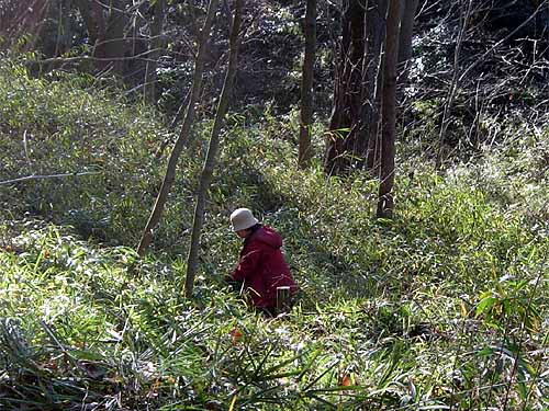 既に、コナラの実生は葉を落としていましたので、夏期に付けた目印を頼りに周囲のアズマネザサを刈り取り、