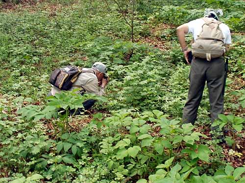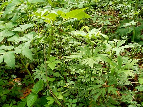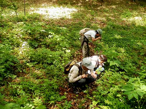 日時 2011/5/4(水)10:00〜11:00 晴 場所 生田緑地 参加 かわさき自然調査団昆虫班 野澤興一、佐野悦子 (市民部会事務局)岩田臣生、岩田芳美 生田緑地にはトリカブトが見られますが、これが「虫に食べられてしまうために花が咲かない。 花を咲かせるためにネットで覆いたい。」ということを、前回の植生管理協議会の席で発言した人がいました。 このため、実態を調査しようということになりました。本当に虫の食害によって花が咲かないのか、だとすればどんな虫が食べているのか。 虫の調査は昆虫班蛾類研究グループの野澤さんに頼むことにして、まず、どこにトリカブトが生えているのかを確認しておくことにしました。 現地を調べてみると、トリカブトはかなり広い範囲に広がり、150本以上は生育していると思われました。 この部分には、トリカブトのほか、シシウドも広がっていました。 草地の植生は春〜秋にかけては 2週間程度の期間で群落の様子が変化していくこともあるので、月 2回程度の調査が必要かと考えています。
