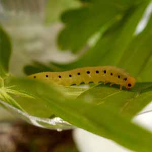 食害されているトリカブトを観察していて、次の2タイプの幼虫を見つけました。 ハグロハバチ幼虫と思われるイモムシが1匹見つかりました。