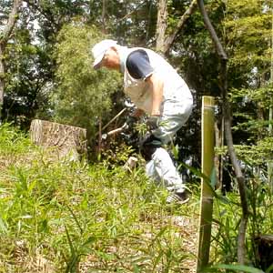 調査を終えてから、切株の萌芽を保護するため周囲50cmの範囲のアズマネザサを刈る活動をしました。