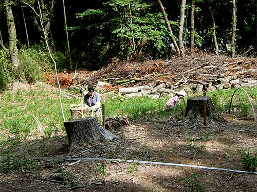 太陽が移動して、コナラの玉切りしたものでつくったスツールの辺りには日影ができていました。