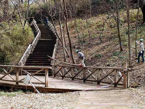 公園管理事務所付近の谷戸への降り口からハンノキ林にかけての園路は1997〜1998年度に再整備が行われ、この時に、