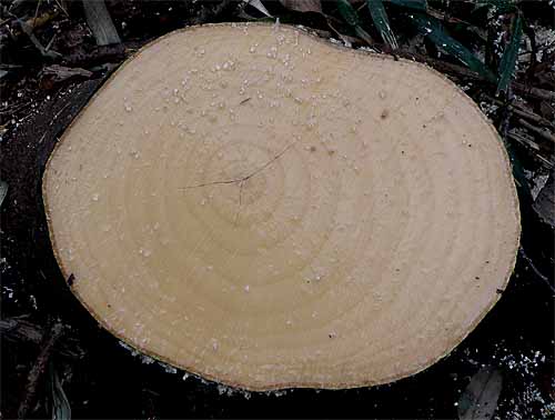 伐採した樹木の断面を見ると、年輪は12〜13年と読めました。