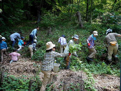 穴を掘り、苗木を植えこみ、周囲のタケニグサ、モミジイチゴ、ヤマグワなどを刈り取っていきました。