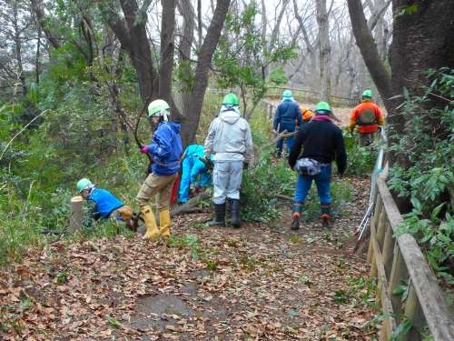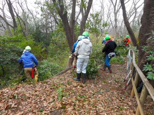 生田緑地整備事務所から芝生広場に伸びる尾根上の探勝路沿いの常緑樹について話し合い、場所を選んで除伐する予定でした。