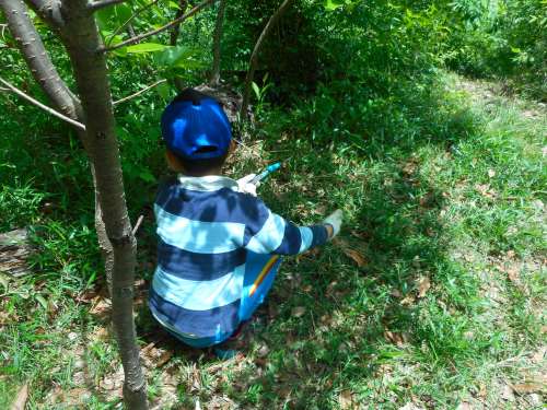 子どもたちだけに任せる前提で、彼にノコギリを携帯させ、それ以外の用具は使わせないことにしました。