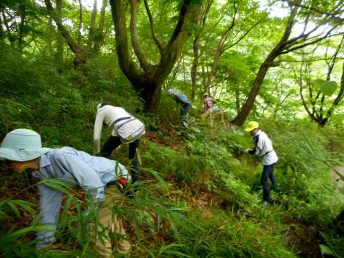全員が探勝路に適度な間隔で並んでアズマネザサを刈りました。