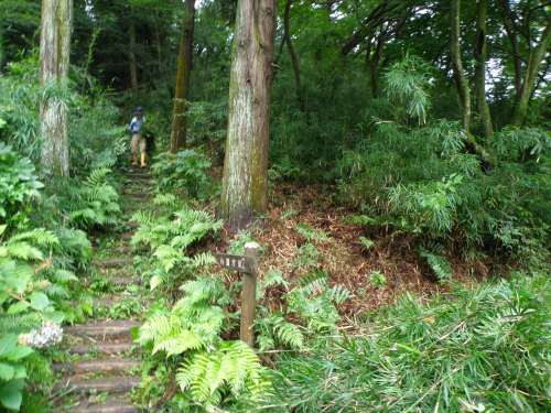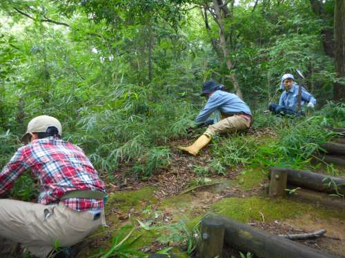 後半の活動は広場から丸太階段で直線的に上る探勝路沿いのアズマネザサ刈りから始めました。
