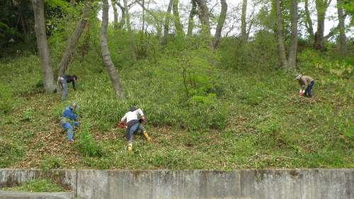 日時 平成29年(2017) 4月15日(土) 10:00〜13:00 場所 生田緑地 中央広場北雑木林 参加者 (富士通) 東 陽一、岩渕裕輝、鈴木幸記、森 正徳 加登勇司、清田陽助、渡部朋子 (生田緑地運営共同事業体)額谷悠夏 (かわさき自然調査団市民部会事務局)岩田臣生、岩田芳美、政野祐一 11名 平成29年度(2017)第1回の里山倶楽部Bは、生田緑地中央広場北雑木林のアズマネザサ刈りを行いました。 当該地区は、2011年5月に市民部会を開き、目標植生を話し合い、ヤマツツジやヤマユリが咲く、明るい雑木林にすることで合意を得ました。 その時は、高さ3mほどのアズマネザサが密生していましたので、夏の間に、多摩区道路公園センターが業者に発注してアズマネザサ刈りをしてくれました。 市民部会としては、同年12月17日に、常緑樹や、竹などの除伐を行い、その後、年1回程度の頻度で、アズマネザサ刈りを実施してきました。 今回は、生田緑地整備事務所裏に集合して、刈込み鋏、桑切鎌、クマデ、手箕などを持って現地に移動しました。 移動の途中、七草峠では、ヒゴスミレやニオイタチツボスミレなどを観察しました。