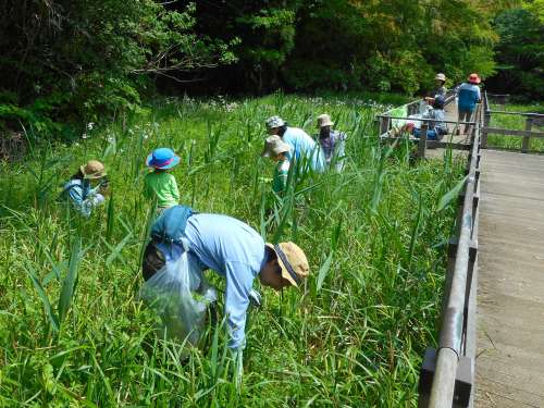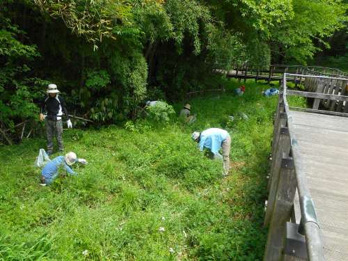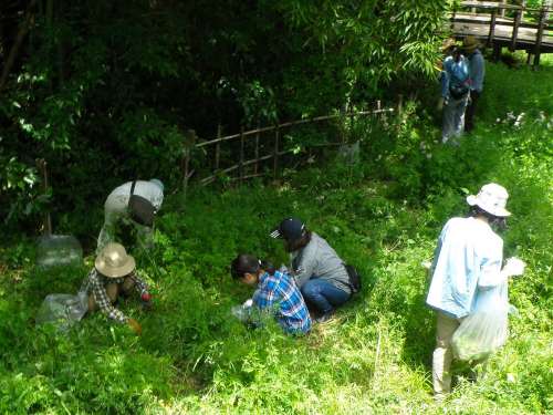 日時 平成29年(2017) 5月 6日(土) 参加者 5年目 山下佳保里、真奈美(中1) 3年目 鈴木麻美、美舟(小6)、眞之介(小3) 2年目 池上幸一、陽子、豪一郎(小1) 藤村望美、渓(幼児)、花(幼児) 山崎孝子、蓮佳(小3) 1年目 新井康悦、みどり、康介(小2) (特別参加) 飯野邦子 (かわさき自然調査団市民部会事務局) 岩田臣生、岩田芳美 19名 一週間前の4/29(土)に里山倶楽部A特別回として、谷戸の梅畑のセリバヒエンソウ駆除を行いました。 今回は、木道を挟んだ上の田圃の反対側の草地のセリバヒエンソウ駆除を行いました。 また、生田緑地の外来種駆除について、来園者に関心を持ってもらいたいと考え、生田緑地内の掲示板に、駆除活動参加者を募集するポスターを掲示してもらいました。 この呼びかけに応募してくれた人が一人いましたので、特別参加としました。