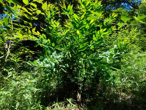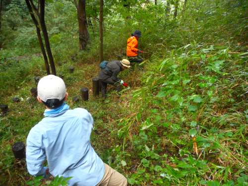 萌芽更新地区下側の園路沿いの部分の草刈りも行いました。 アズマネザサや、ヤマグワ(またはヒメコウゾ)、オニグルミなどの実生を刈りました。 枯れかけたタケニグサ、青い実をつけたカラスウリ、花盛りのオニドコロなども適度に刈りました。 保護したいのですが、ツルニンジンの一部も、仕方なく刈りました。