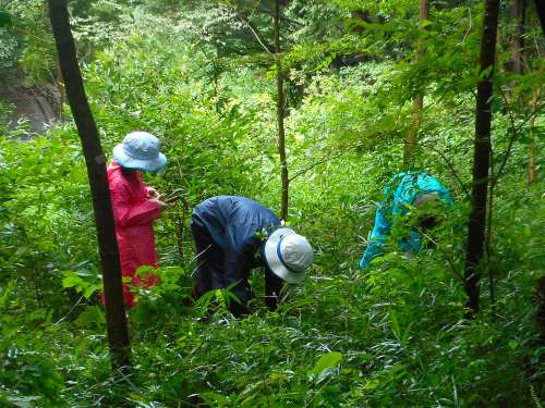 A06-1b 地区の一部の希少種保護のためのアズマネザサ刈りは、頼りになる 3 人にお願いしました。 雨で濡れているので、子どもたちには不向きです。