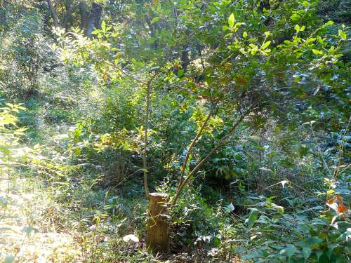 今年1〜2月に伐採したクヌギ・コナラ・イヌザクラ等の萌芽は5月、無数のアブラムシに覆われていましたが、何とか駆除できて、萌芽枝を伸ばしていました。 今回の一番の目的は、伐り株の周囲のアズマネザサを刈り、混みあった萌芽枝を整理することでしたが、何とか、やり終えました。