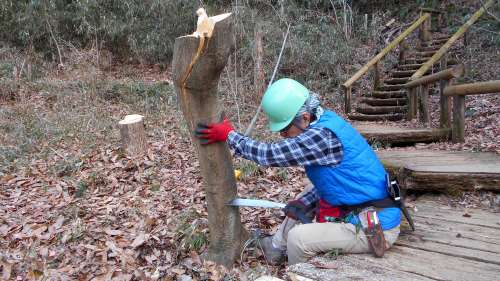 樹冠は斜面下方(A06-1a)にありましたので、手摺を叩き落してしまった部分に倒そうと試みましたが、幹が屈曲していたり、周りの樹木にかかったりして、思い通りにはいきませんでした。