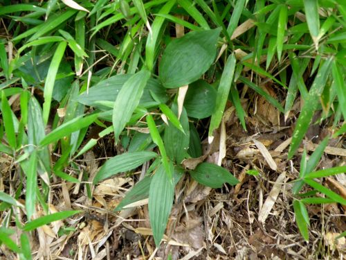 斜面はかなり急で滑りやすいのですが、40〜50cm の高さのアズマネザサを刈ると、キンランが現れる場所も点々とあり、これらを避けながらの作業は疲れました。
