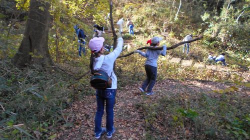 お昼のお弁当を食べ終えて、午後の活動を始めました。 子どもたちは、長いアズマネザサを使って遊び始めました。